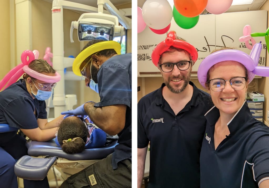 While Mellony was co-leading the clinical team, I was working in our sterilisation area and working chair side dental assisting. One of the students that came through our chair who was quite memorable was a grade 5 student who needed work on 11 of his teeth; his front teeth were mostly black and misshapen from decay, and his molars had large holes in them, some looking more like craters than teeth.